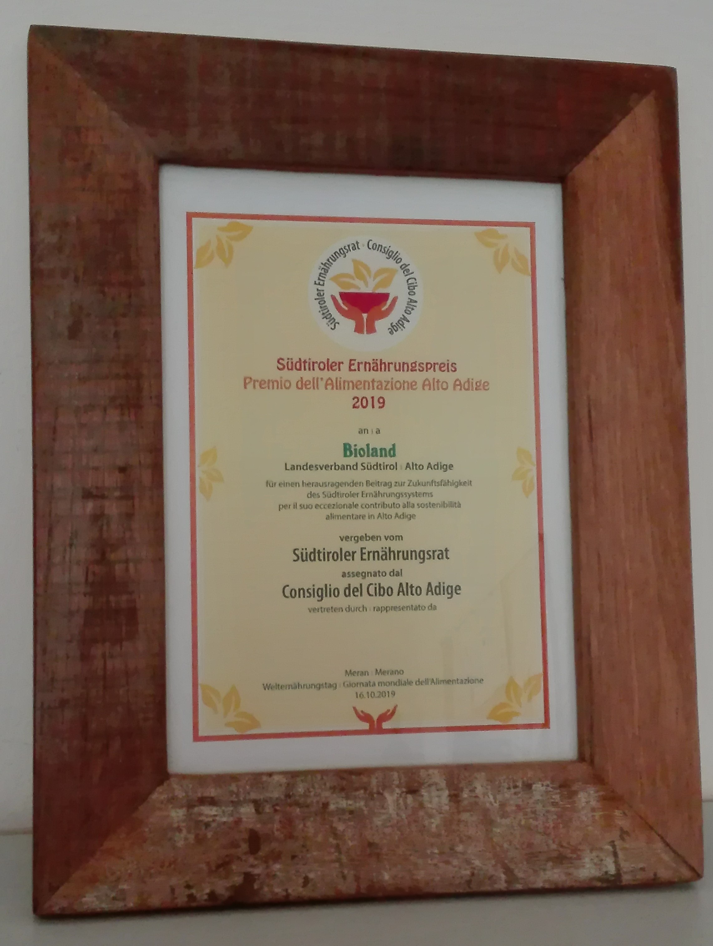 2019 (Oktober): Verleihung des 1. Südtiroler Ernährungspreises anlässlich des Welternährungstags (16. Oktober) an den Bioland Verband Südtirol für die besonderen Leistungen im Bereich der nachhaltigen Lebensmittelproduktion und für den Erhalt der ländlichen Umwelt