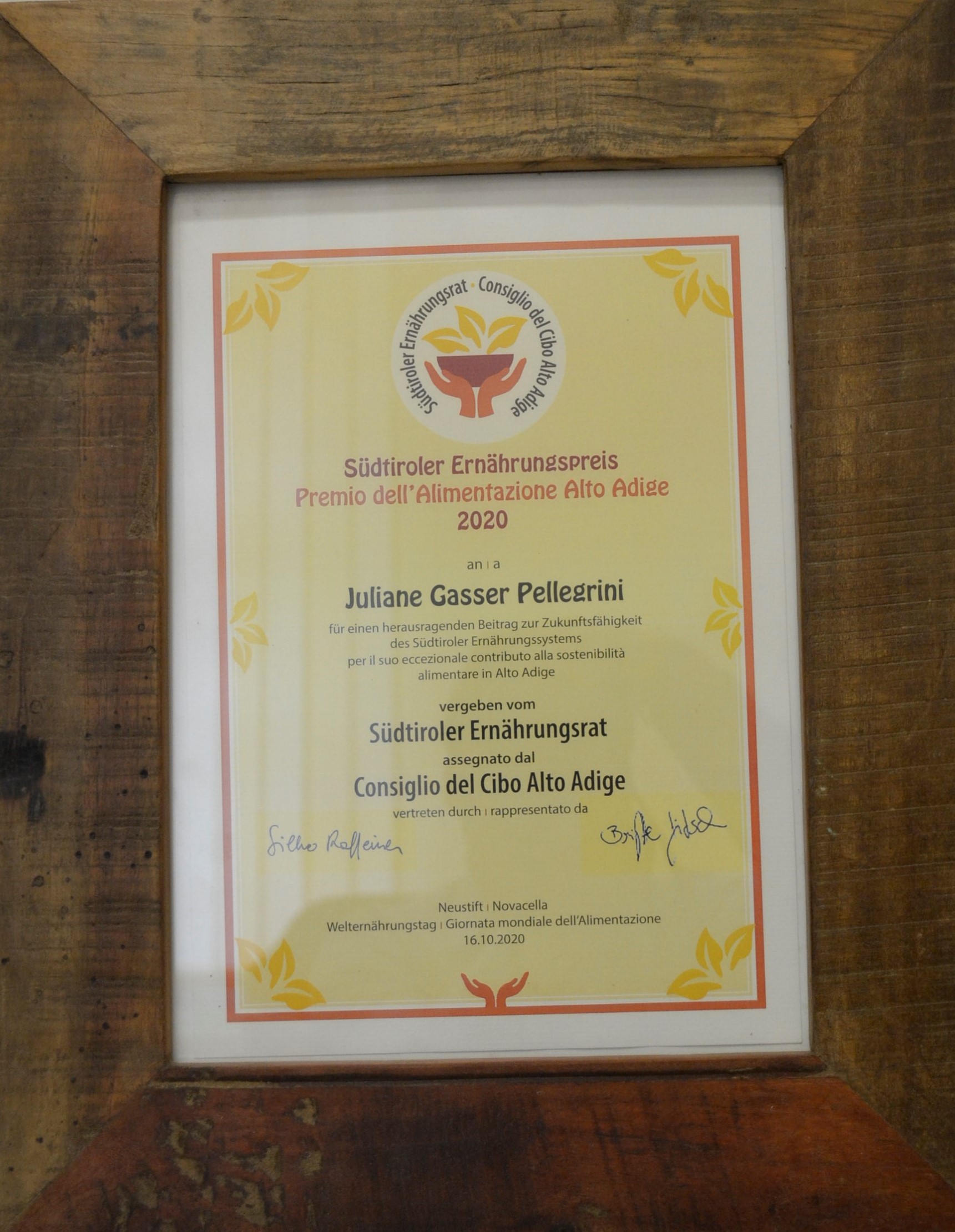 2020 (Oktober): Verleihung des 2. Südtiroler Ernährungspreises anlässlich des Welternährungstags (16. Oktober) an Juliane Gasser Pellegrini für ihr berufliches Wirken, das entscheidend zur Weiterentwicklung und Zukunftsfähigkeit des Südtiroler Ernährungssystems beigetragen hat